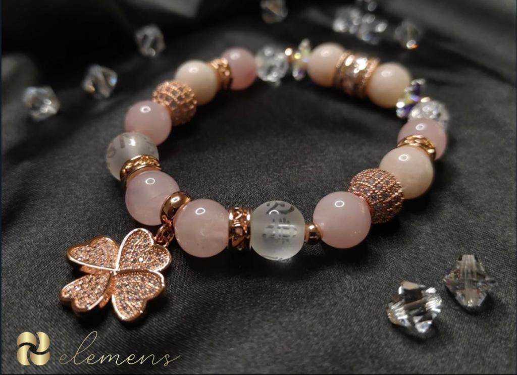 Crafted with genuine rose quartz gemstones and accented with shimmering rose gold details, this elegant bracelet symbolizes love, harmony, and emotional healing. The sparkling four-leaf clover charm invites good fortune and positivity into your life. Wear this stunning piece to uplift your spirit, enhance self-love, and bring a touch of luxurious serenity to your style.